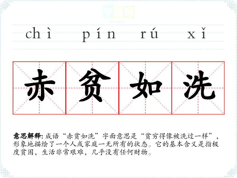 成语“赤贫如洗”字面意思是“贫穷得像被洗过一样”,形象地描绘了一个人或家庭一无所有的状态。它的基本含义是指极度贫困,生活非常艰难,几乎没有任何财物。