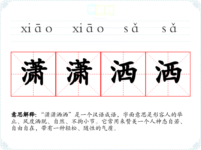 “潇潇洒洒”是一个汉语成语,字面意思是形容人的举止、风度洒脱、自然、不拘小节。它常用来赞美一个人神态自若、自由自在,带有一种轻松、随性的气质。