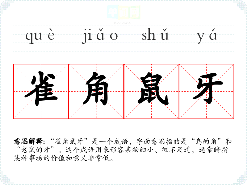 “雀角鼠牙”是一个成语,字面意思指的是“鸟的角”和“老鼠的牙”。这个成语用来形容某物细小、微不足道,通常暗指某种事物的价值和意义非常低。