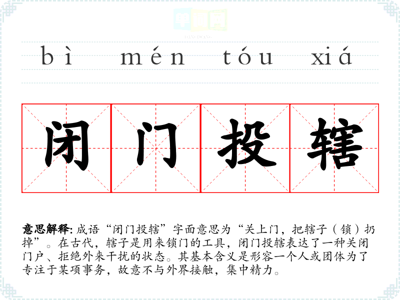 成语“闭门投辖”字面意思为“关上门,把辖子(锁)扔掉”。在古代,辖子是用来锁门的工具,闭门投辖表达了一种关闭门户、拒绝外来干扰的状态。其基本含义是形容一个人或团体为了专注于某项事务,故意不与外界接触,集中精力。