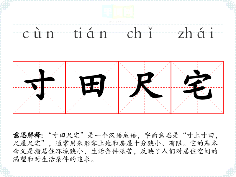 “寸田尺宅”是一个汉语成语,字面意思是“寸土寸田,尺屋尺宅”,通常用来形容土地和房屋十分狭小、有限。它的基本含义是指居住环境狭小,生活条件艰苦,反映了人们对居住空间的渴望和对生活条件的追求。