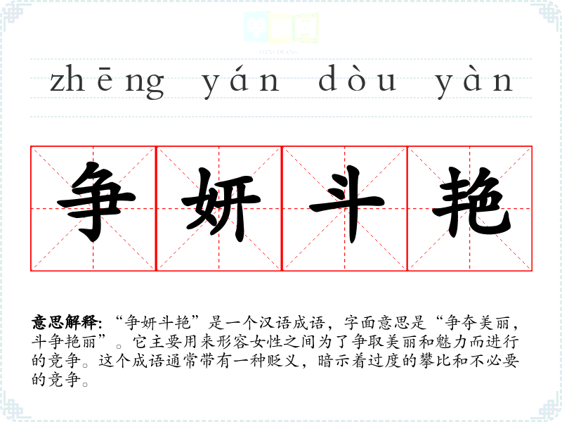 “争妍斗艳”是一个汉语成语,字面意思是“争夺美丽,斗争艳丽”。它主要用来形容女性之间为了争取美丽和魅力而进行的竞争。这个成语通常带有一种贬义,暗示着过度的攀比和不必要的竞争。
