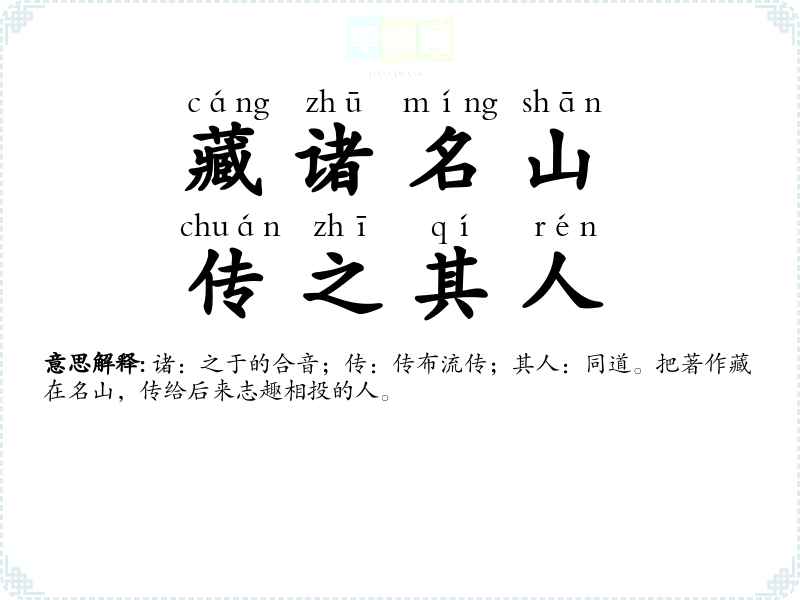 | 藏之名山,传之其人 | 把著作藏在名山,传给志趣相投的人。 |