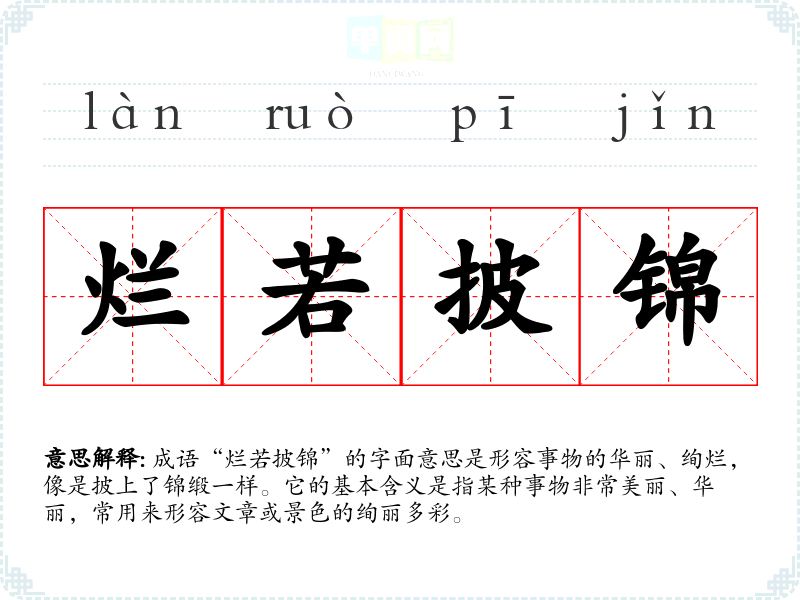 成语“烂若披锦”的字面意思是形容事物的华丽、绚烂,像是披上了锦缎一样。它的基本含义是指某种事物非常美丽、华丽,常用来形容文章或景色的绚丽多彩。