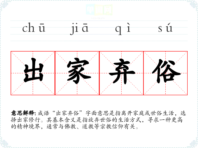 成语“出家弃俗”字面意思是指离开家庭或世俗生活,选择出家修行。其基本含义是指放弃世俗的生活方式,寻求一种更高的精神境界,通常与、道教等信仰有关。