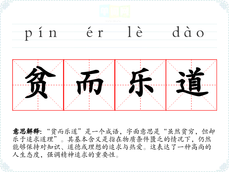 “贫而乐道”是一个成语,字面意思是“虽然贫穷,但却乐于追求道理”。其基本含义是指在物质条件匮乏的情况下,仍然能够保持对知识、道德或理想的追求与热爱。这表达了一种高尚的人生态度,强调精神追求的重要性。