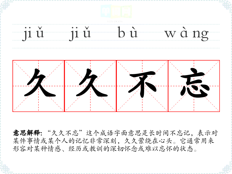 | 久久不忘 | 久久:好久,很久。形容印象深刻。 |