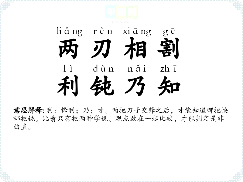 | 两刃相割,利钝乃知 | 利:锋利;乃:才。两把刀子交锋之后,才能知道哪把快哪把钝。比喻只有把两种学说、观点放在一起比较,才能判定是非曲直。 |