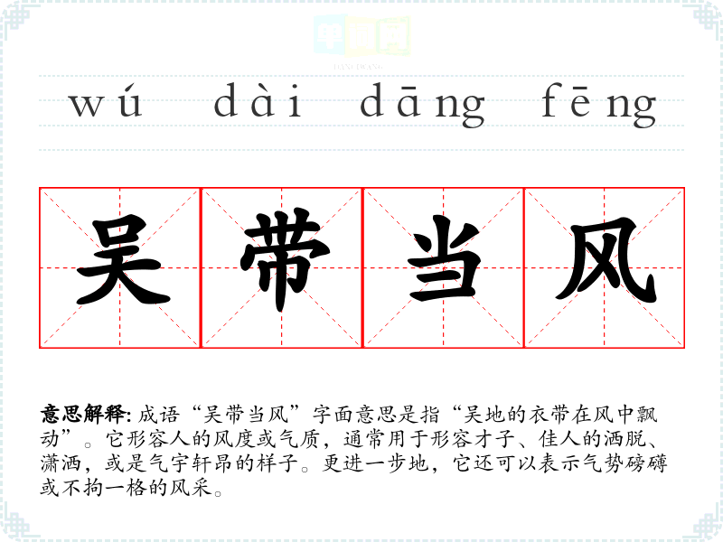 成语“吴带当风”字面意思是指“吴地的衣带在风中飘动”。它形容人的风度或气质,通常用于形容才子、佳人的洒脱、潇洒,或是气宇轩昂的样子。更进一步地,它还可以表示气势磅礴或不拘一格的风采。