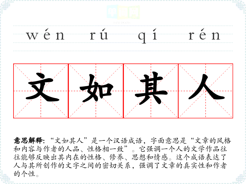 “文如其人”是一个汉语成语,字面意思是“文章的风格和内容与作者的人品、性格相一致”。它强调一个人的文学作品往往能够反映出其内在的性格、修养、思想和情感。这个成语表达了人与其所创作的文字之间的密切关系,强调了文章的真实性和作者的个性。