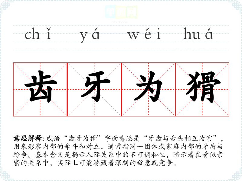 “齿牙为猾”出自《左传》,原文为“齐君与鲁君会于阳夏,鲁君曰:‘愿君以齐国之士,助我攻宋。’齐君答曰:‘舌齿为猾,君子之道,必为国之谋’。”其中“齿牙”指代舌头与牙齿,形象地说明了即使在最亲密的关系中,也可能存在潜在的对立与矛盾。