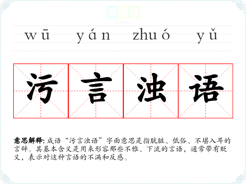 成语“污言浊语”字面意思是指肮脏、低俗、不堪入耳的言辞。其基本含义是用来形容那些不雅、下流的言语,通常带有贬义,表示对这种言语的不满和反感。