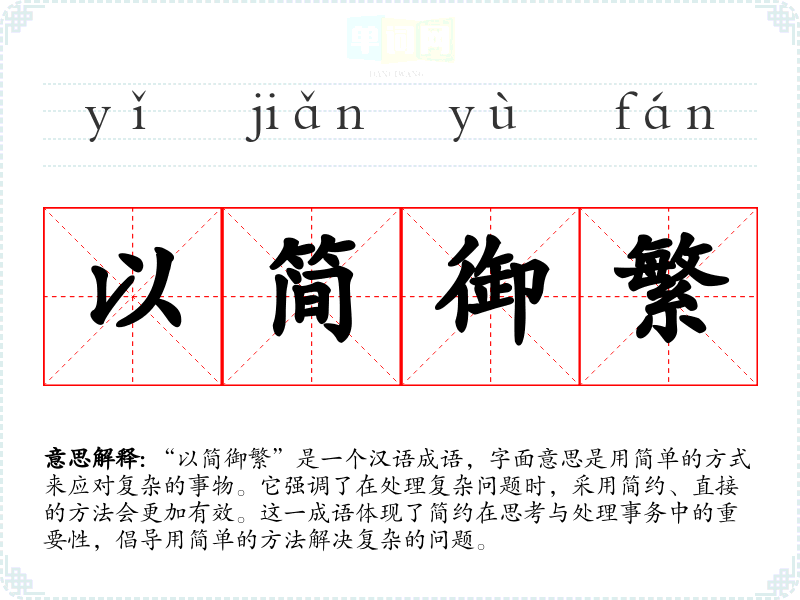 | 以简御繁 | 御:治理,统治。以简便的办法去对付复杂繁多的事情。 |