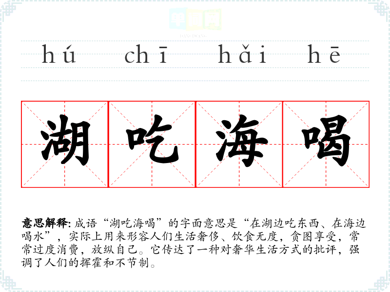 成语“湖吃海喝”的字面意思是“在湖边吃东西、在海边喝水”,实际上用来形容人们生活奢侈、饮食无度,贪图享受,常常过度消费,放纵自己。它传达了一种对奢华生活方式的批评,强调了人们的挥霍和不节制。