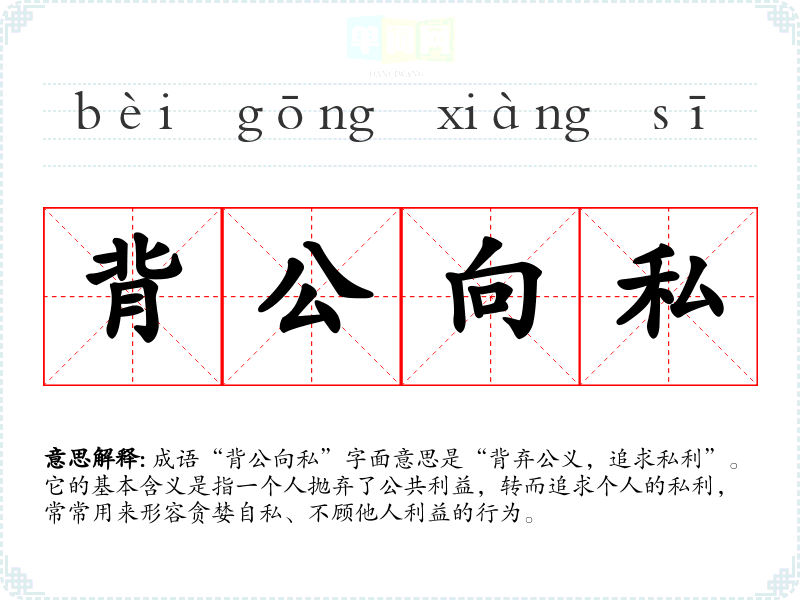 成语“背公向私”字面意思是“背弃公义,追求私利”。它的基本含义是指一个人抛弃了公共利益,转而追求个人的私利,常常用来形容贪婪自私、不顾他人利益的行为。
