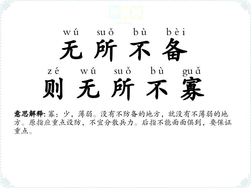 | 内修政治,外治武备 | 修:修治;政治:政策;治:管理;武备:军备。对内修明政治,对外做好军事准备。 |
