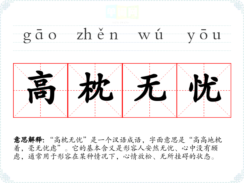 “高枕无忧”是一个汉语成语,字面意思是“高高地枕着,毫无忧虑”。它的基本含义是形容人安然无忧、心中没有顾虑,通常用于形容在某种情况下,心情放松、无所挂碍的状态。