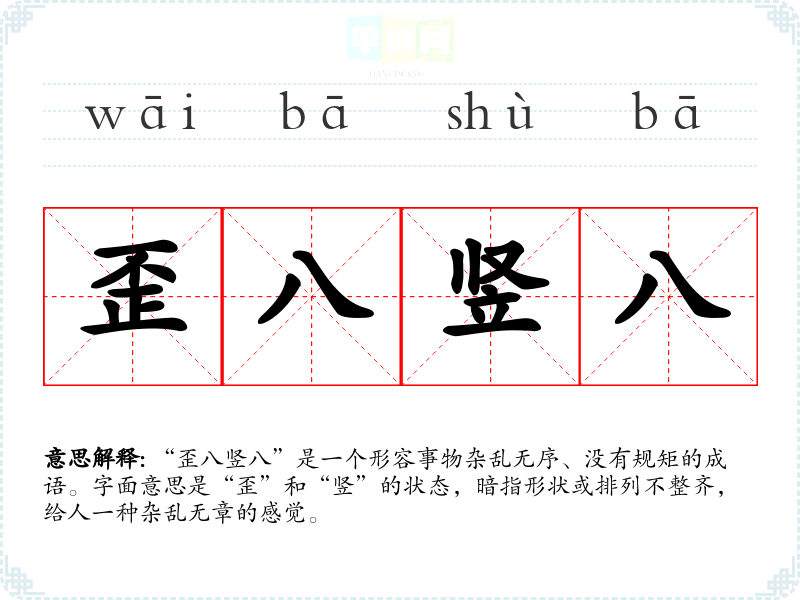 “歪八竖八”是一个形容事物杂乱无序、没有规矩的成语。字面意思是“歪”和“竖”的状态,暗指形状或排列不整齐,给人一种杂乱无章的感觉。