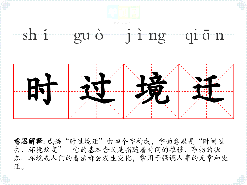 成语“时过境迁”由四个字构成,字面意思是“时间过去,环境改变”。它的基本含义是指随着时间的推移,事物的状态、环境或人们的看法都会发生变化,常用于强调人事的无常和变迁。