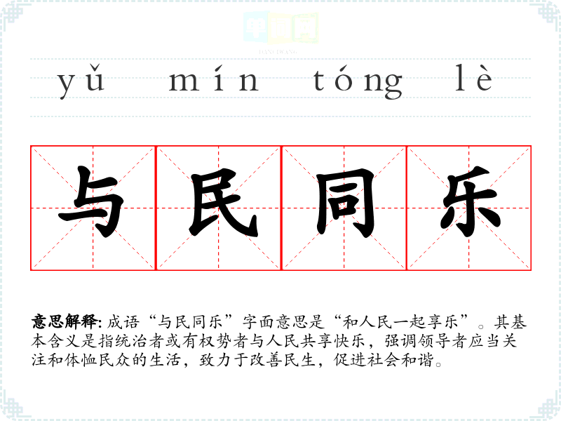 成语“与民同乐”字面意思是“和人民一起享乐”。其基本含义是指统治者或有权势者与人民共享快乐,强调领导者应当关注和体恤民众的生活,致力于改善民生,促进社会和谐。