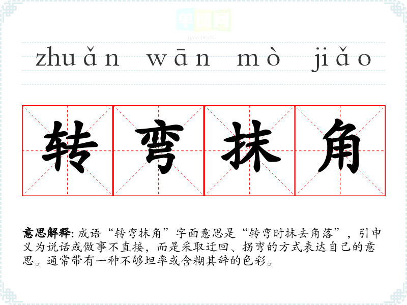 成语“转弯抹角”字面意思是“转弯时抹去角落”,引申义为说话或做事不直接,而是采取迂回、拐弯的方式表达自己的意思。通常带有一种不够坦率或含糊其辞的色彩。