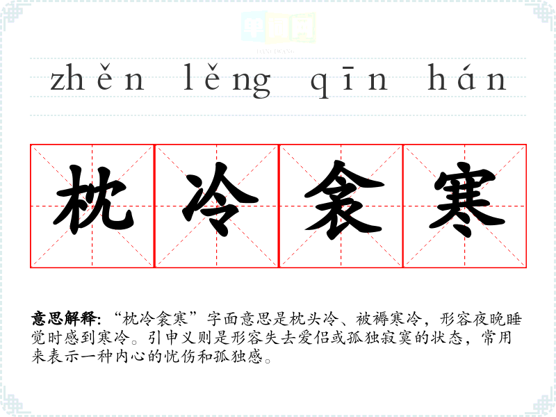 “枕冷衾寒”字面意思是枕头冷、被褥寒冷,形容夜晚睡觉时感到寒冷。引申义则是形容失去爱侣或孤独寂寞的状态,常用来表示一种内心的忧伤和孤独感。
