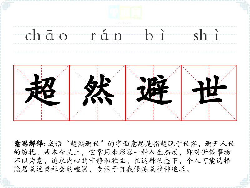 成语“超然避世”的字面意思是指超脱于世俗,避开人世的纷扰。基本含义上,它常用来形容一种人生态度,即对世俗事物不以为意,追求内心的宁静和独立。在这种状态下,个人可能选择隐居或远离社会的喧嚣,专注于自我修炼或精神追求。