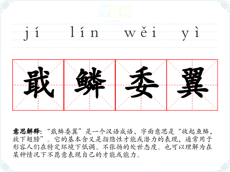 “戢鳞委翼”是一个汉语成语,字面意思是“收起鱼鳞,放下翅膀”。它的基本含义是指隐性才能或潜力的表现,通常用于形容人们在特定环境下低调、不张扬的处世态度。也可以理解为在某种情况下不愿意表现自己的才能或能力。