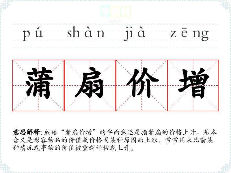 成语“蒲扇价增”的字面意思是指蒲扇的价格上升。基本含义是形容物品的价值或价格因某种原因而上涨,常常用来比喻某种情况或事物的价值被重新评估或上升。