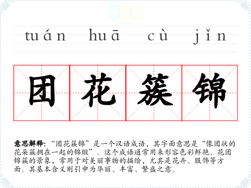 “团花簇锦”是一个汉语成语,其字面意思是“像团状的花朵簇拥在一起的锦缎”。这个成语通常用来形容色彩鲜艳、花团锦簇的景象,常用于对美丽事物的描绘,尤其是花卉、服饰等方面。其基本含义则引申为华丽、丰富、繁盛之意。