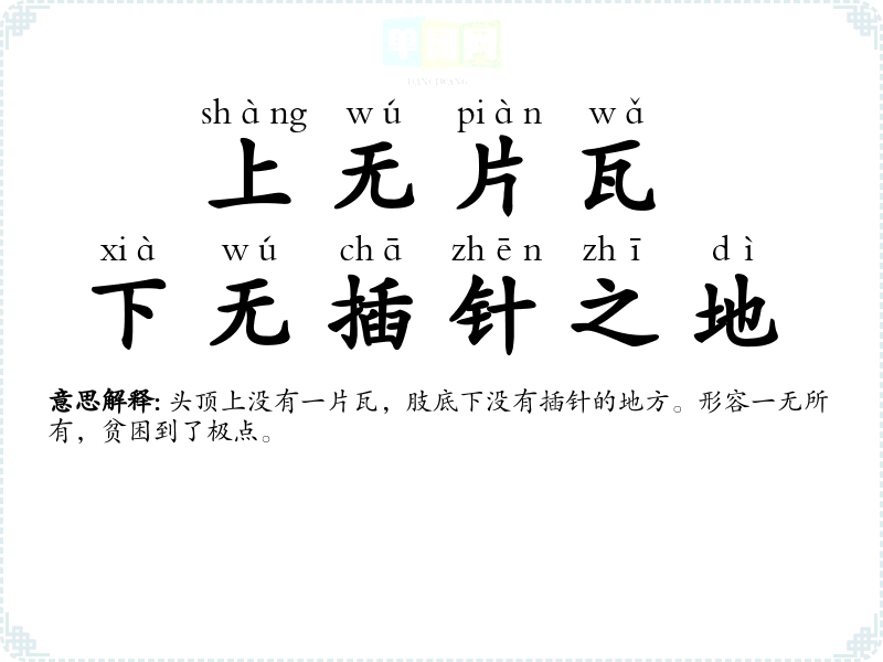 | 上无片瓦,下无立锥之地 | 形容一无所有,贫困到了极点。 |