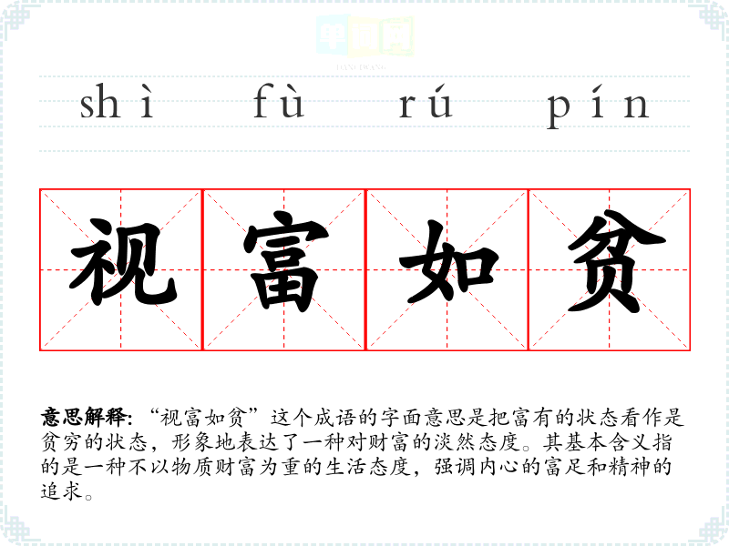 “视富如贫”通常用于表达一种淡泊名利、追求内心平和的态度。在文学作品中,常常用于描绘主人公对财富的无所谓,看重的是人际关系和精神追求。在日常对话中,也可用来形容那些不以财富衡量人和事的人。例如,在演讲中,领导者可能会提到这一成语来激励团队追求价值而非金钱。