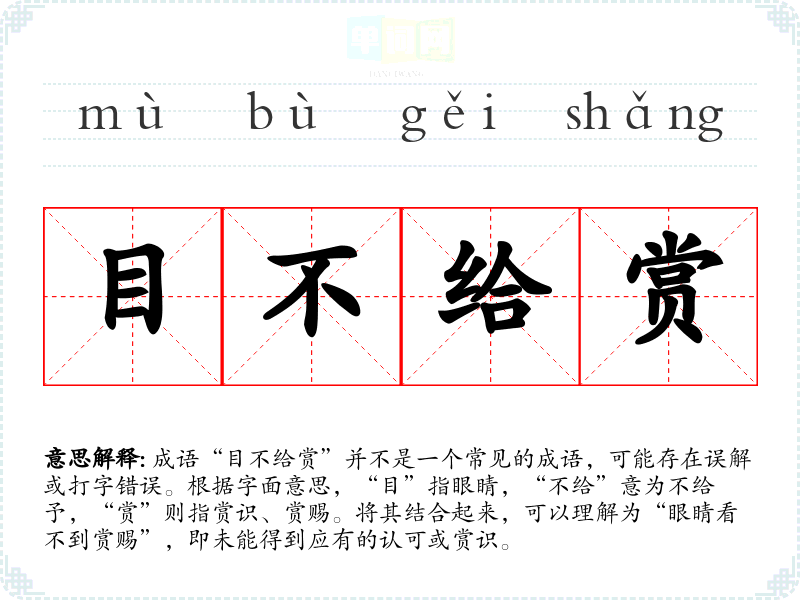 由于“目不给赏”并没有明确的历史背景或典故,它可能是现代口语中的表达,或是对某个成语的误用。与之相似的成语如“未被重视”或“无人问津”可能更为恰当。