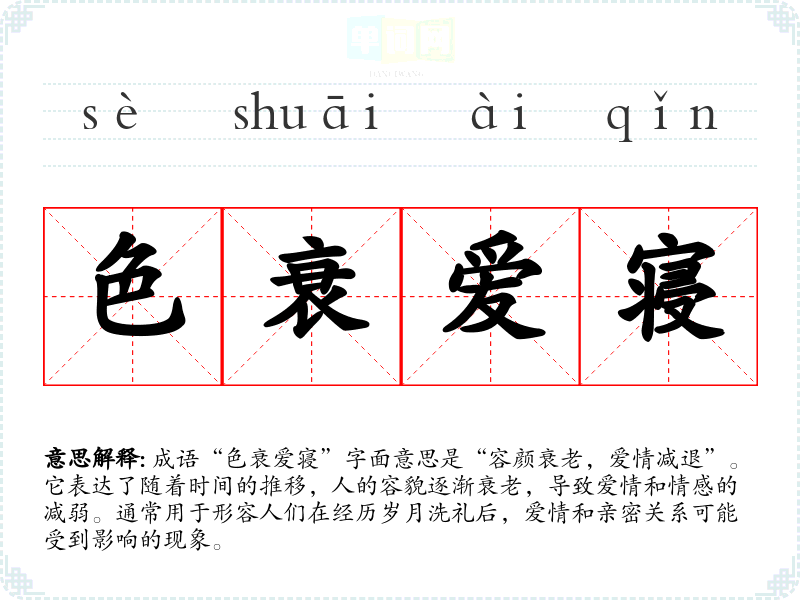 成语“色衰爱寝”字面意思是“容颜衰老,爱情减退”。它表达了随着时间的推移,人的容貌逐渐衰老,导致爱情和情感的减弱。通常用于形容人们在经历岁月洗礼后,爱情和亲密关系可能受到影响的现象。