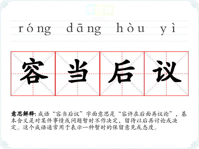 成语“容当后议”字面意思是“容许在后面再议论”,基本含义是对某件事情或问题暂时不作决定,留待以后再讨论或决定。这个成语通常用于表示一种暂时的保留意见或态度。