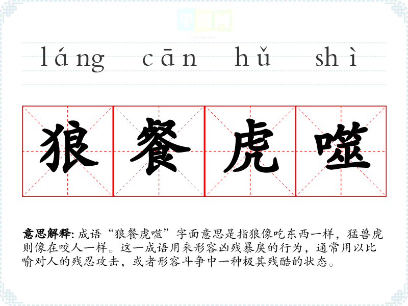 成语“狼餐虎噬”字面意思是指狼像吃东西一样,猛兽虎则像在咬人一样。这一成语用来形容凶残暴戾的行为,通常用以比喻对人的残忍攻击,或者形容斗争中一种极其残酷的状态。