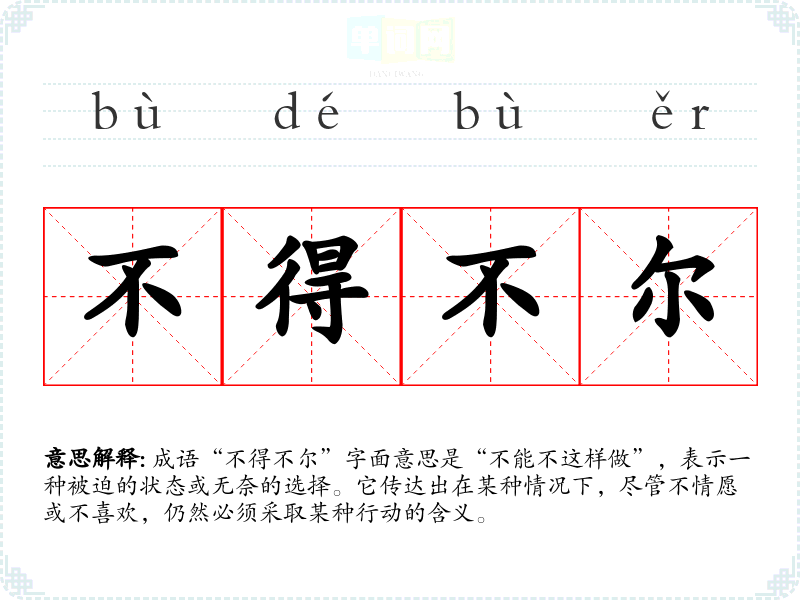 成语“不得不尔”字面意思是“不能不这样做”,表示一种被迫的状态或无奈的选择。它传达出在某种情况下,尽管不情愿或不喜欢,仍然必须采取某种行动的含义。