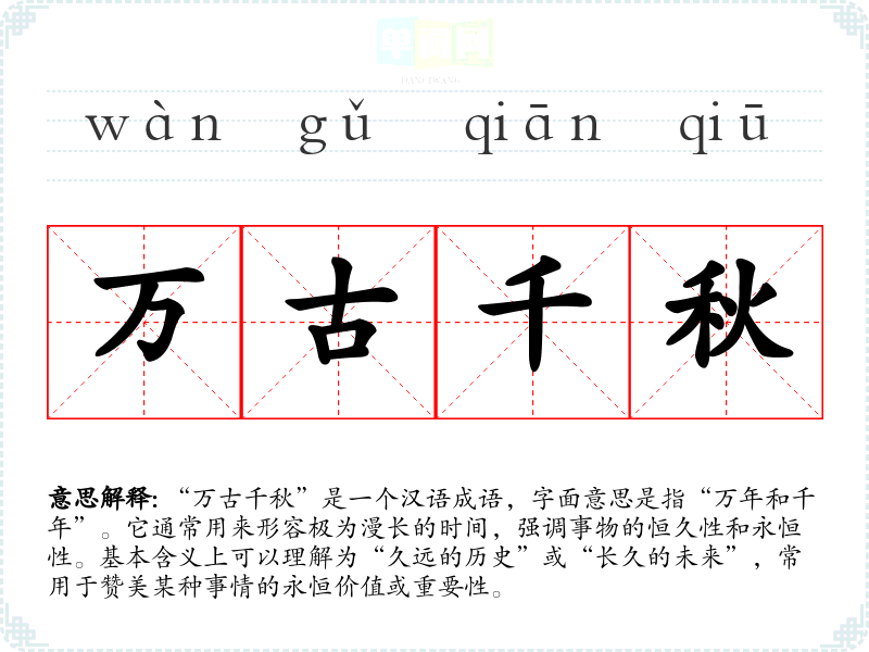 “万古千秋”最早出现在古代文学作品中,具体的历史背景较为模糊,但可以推测它与古代对时间的理解、对历史的尊重以及对未来的展望有关。成语中“万古”与“千秋”都表示极长的时间,体现了古人对时间的深刻认识和感慨。