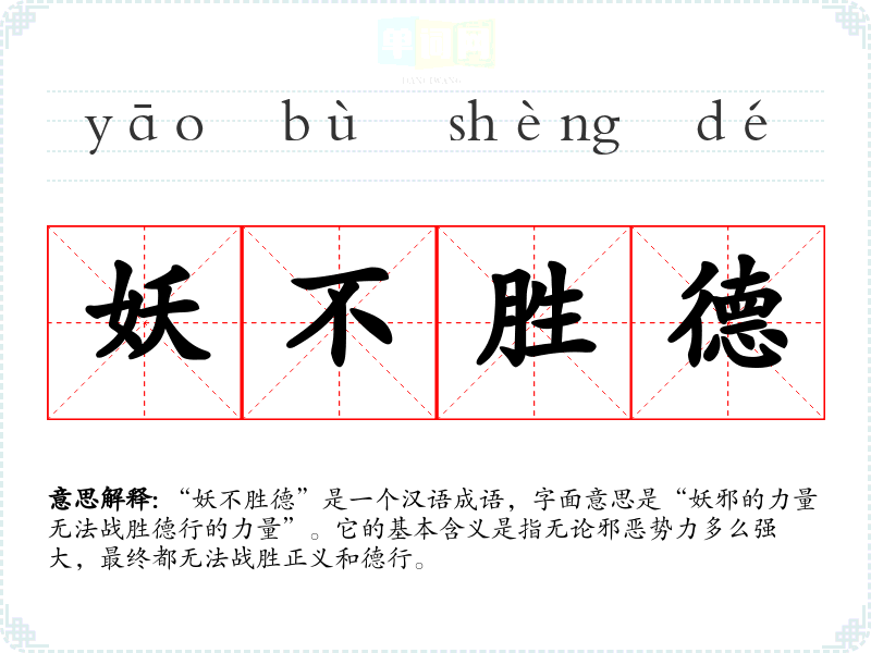 “妖不胜德”是一个汉语成语,字面意思是“妖邪的力量无法战胜德行的力量”。它的基本含义是指无论邪恶势力多么强大,最终都无法战胜正义和德行。