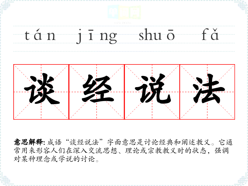 成语“谈经说法”字面意思是讨论经典和阐述教义。它通常用来形容人们在深入交流思想、理论或**教义时的状态,强调对某种理念或学说的讨论。