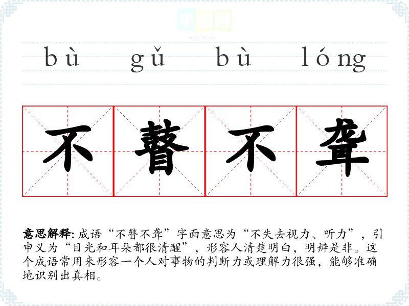 成语“不瞽不聋”字面意思为“不失去视力、听力”,引申义为“目光和耳朵都很清醒”,形容人清楚明白,明辨是非。这个成语常用来形容一个人对事物的判断力或理解力很强,能够准确地识别出真相。