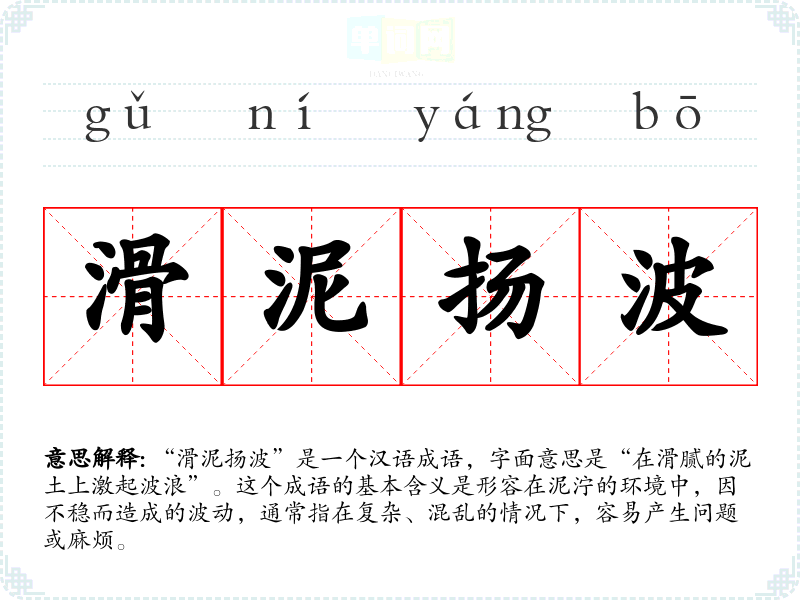 “滑泥扬波”是一个汉语成语,字面意思是“在滑腻的泥土上激起波浪”。这个成语的基本含义是形容在泥泞的环境中,因不稳而造成的波动,通常指在复杂、混乱的情况下,容易产生问题或麻烦。