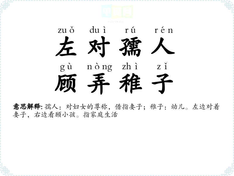 | 左对孺人,右顾稚子 | 孺人:对妇女的尊称,借指妻子;稚子:幼儿。左边对着妻子,右边看顾小孩。指家庭生活 |