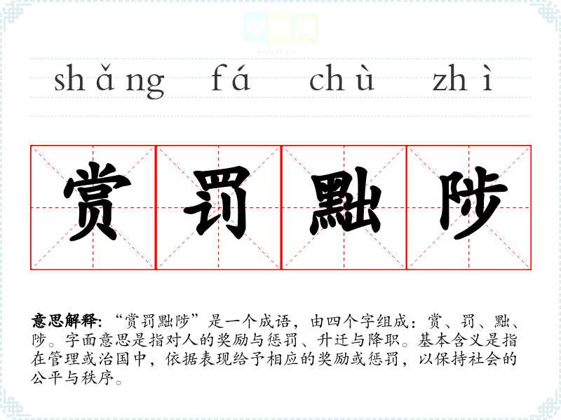“赏罚黜陟”是一个成语,由四个字组成:赏、罚、黜、陟。字面意思是指对人的奖励与惩罚、升迁与降职。基本含义是指在管理或治国中,依据表现给予相应的奖励或惩罚,以保持社会的公平与秩序。