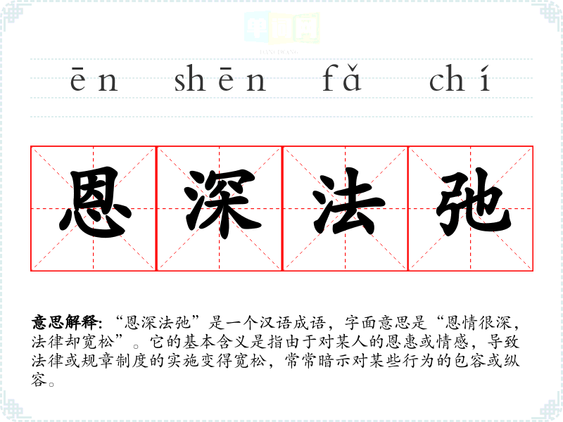 “恩深法弛”是一个汉语成语,字面意思是“恩情很深,法律却宽松”。它的基本含义是指由于对某人的恩惠或情感,导致法律或规章制度的实施变得宽松,常常暗示对某些行为的包容或纵容。