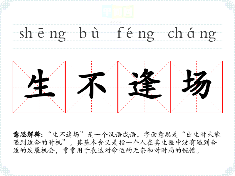 “生不逢场”是一个汉语成语,字面意思是“出生时未能遇到适合的时机”。其基本含义是指一个人在其生涯中没有遇到合适的发展机会,常常用于表达对命运的无奈和对时局的惋惜。
