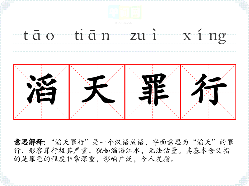| 滔天罪行 | 滔天:漫天。弥天的大罪。比喻罪恶极大。 |