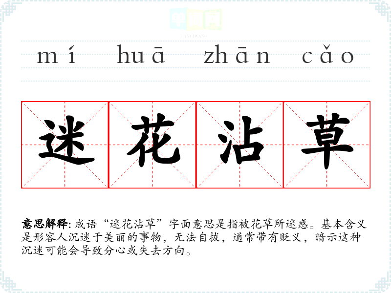 成语“迷花沾草”字面意思是指被花草所迷惑。基本含义是形容人沉迷于美丽的事物,无法自拔,通常带有贬义,暗示这种沉迷可能会导致分心或失去方向。