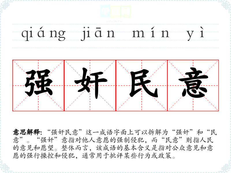 “强奸民意”这一成语字面上可以拆解为“强奸”和“民意”。“强奸”意指对他人意愿的强制侵犯,而“民意”则指人民的意见和愿望。整体而言,该成语的基本含义是指对公众意见和意愿的强行操控和侵犯,通常用于批评某些行为或政策。