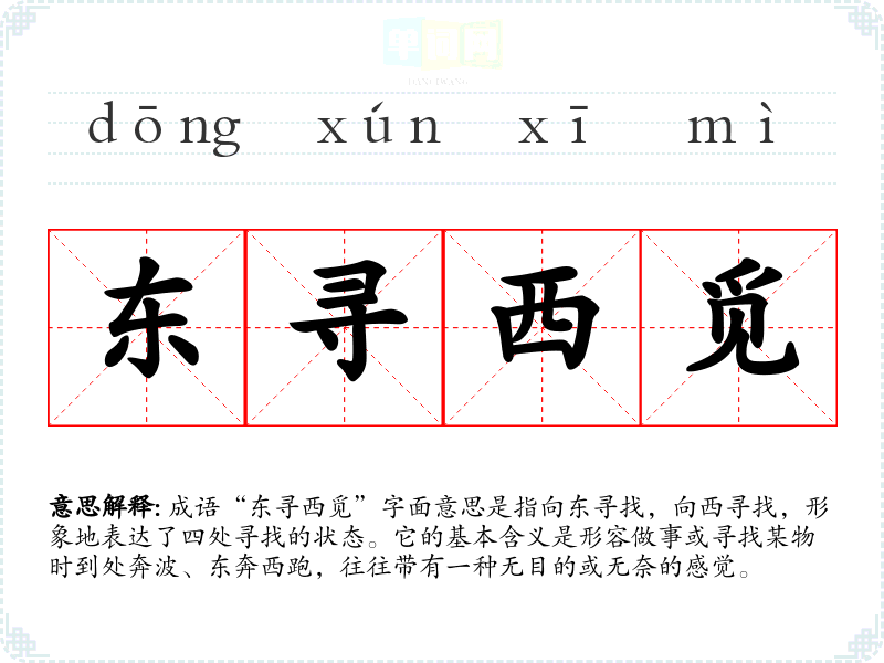 成语“东寻西觅”字面意思是指向东寻找,向西寻找,形象地表达了四处寻找的状态。它的基本含义是形容做事或寻找某物时到处奔波、东奔西跑,往往带有一种无目的或无奈的感觉。